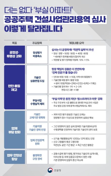 이번 개정안은 조달청이 집행하는 지난해(6,002억 원)보다 26% 증가한 연 8천억 원 규모의 LH 공공주택 건설사업관리용역에 적용되며 기술력과 신뢰도가 높은 업체의 수주 기회를 확대하는 데 초점을 맞췄다.