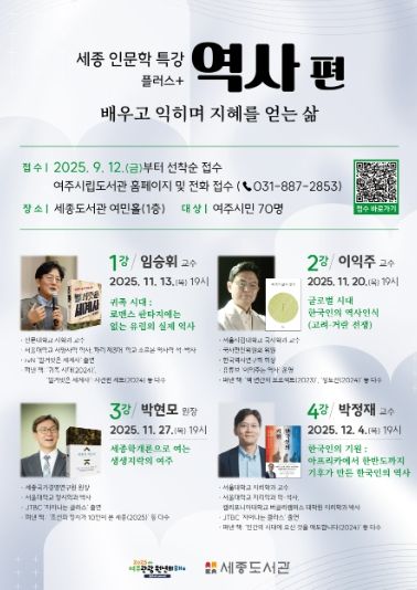 뉴한국방송뉴스통신사 신유철기자 기자 | 여주시는 오는 11월 13일부터 12월 4일까지 세종도서관 여민홀(1층)에서 '세종 인문학 특강 플러스+' ‘역사 편’을 4회 운영한다.