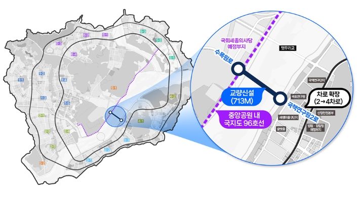 신설 교량은 금강 북측 수목원로와 남측 국책연구원2로를 잇는 총연장 713m, 왕복 4차로로 건설된다. 원활한 차량 흐름을 위해 신설 교량과 이어지는 국책연구원2로는 2차로→4차로로 확장하고, 인근 교차로도 정비한다.