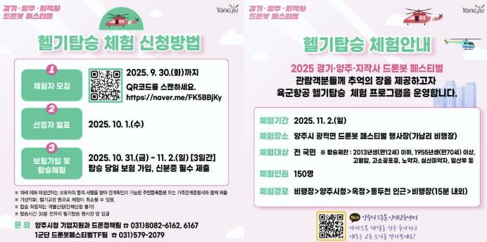 신청을 희망하는 시민은 양주시 공식 홈페이지 또는 SNS채널을 검색하여 접속한 뒤, ‘2025 드론봇 페스티벌 헬기탑승체험’ 안내 게시물을 참고하여 온라인으로 신청할 수 있다.