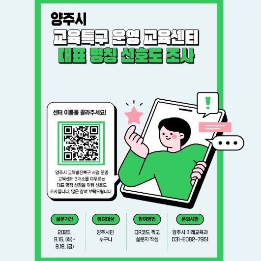 뉴한국방송뉴스통신사 신유철기자 기자 | 양주시가 교육발전특구 시범지역 사업을 통해 조성한 교육센터의 대표 명칭 선정을 위해 ‘시민이 직접 뽑는 네이밍 선호도 조사’를 오는 19일까지 실시한다.