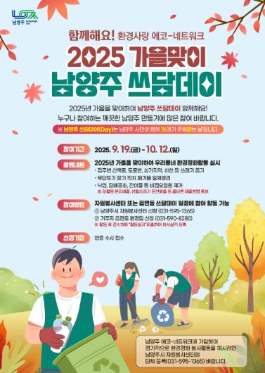 뉴한국방송뉴스통신사 신유철기자 기자 | 남양주시는 오는 9월 19일부터 10월 12일까지 가을철을 맞이해 쓰레기를 치우고 도시를 청결하게 하는 ‘2025 가을맞이 남양주 쓰담데이’를 추진한다고 밝혔다.