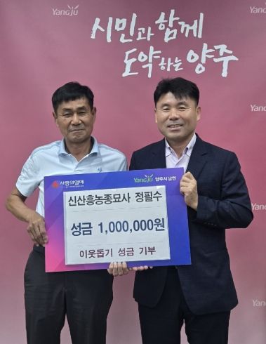 뉴한국방송뉴스통신사 신유철기자 기자 | 양주시 남면 신산흥농 종묘사가 지난 17일 남면 행정복지센터를 방문해 이웃돕기 성금 100만원을 전달했다.