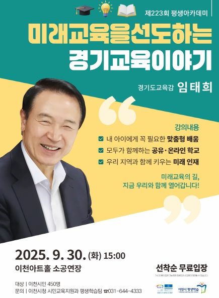 뉴한국방송뉴스통신사 신유철기자 기자 | 이천시는 9월 30일 오후 3시, 이천아트홀 소공연장에서 임태희 경기도교육감을 초청해 “미래교육을 선도하는 경기교육 이야기”라는 주제로 제 223회 이천 평생아카데미를 개최한다.