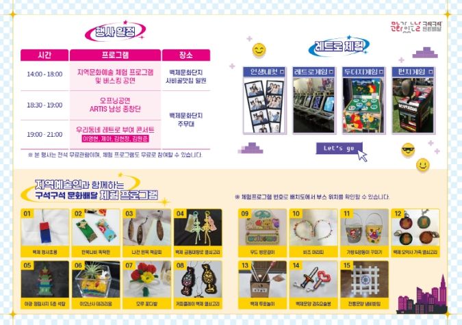 체험 부스에서는 ▲백제 청사초롱 만들기 ▲한복 나비 똑딱 핀 만들기 ▲나전 원목 책갈피 ▲우드 방문걸이 꾸미기 ▲비즈 머리띠 ▲백제금동대향로 열쇠고리 만들기 등 총 15종의 체험 프로그램이 운영되며, 남녀노소 누구나 무료로 참여할 수 있다.