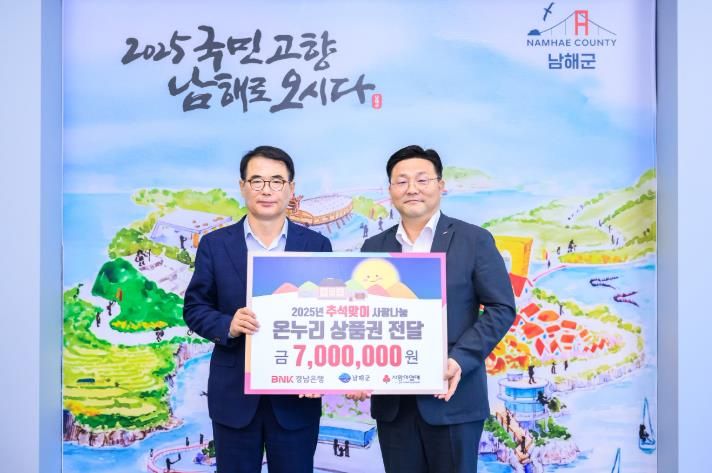 뉴한국방송뉴스통신사 신유철기자 기자 | 남해군은 지난 30일 BNK경남은행 남해지점이 추석 명절을 앞두고 700만원 상당의 온누리상품권을 기탁했다고 밝혔다.