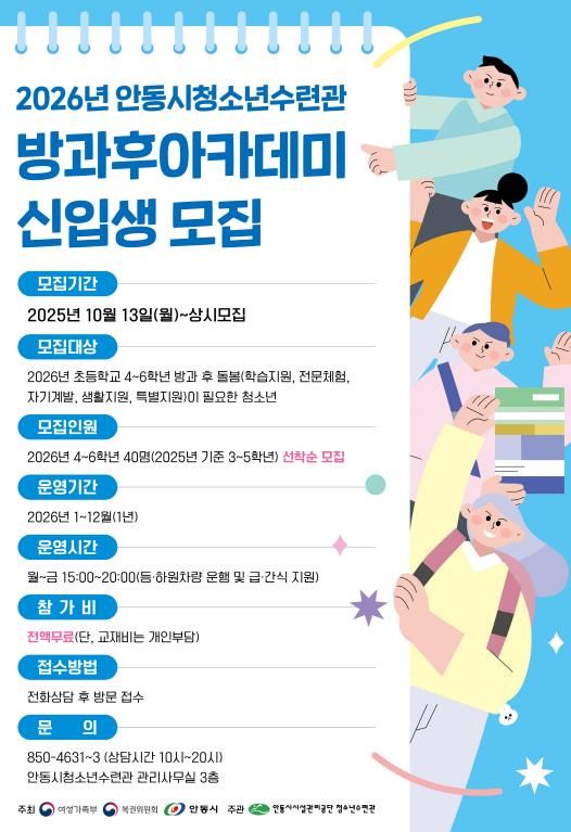 뉴한국방송뉴스통신사 신유철기자 기자 | 안동시시설관리공단이 운영하는 청소년수련관 방과후아카데미가 오는 10월 13일부터 2026년도 신입생 모집을 시작한다.