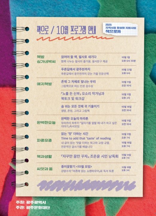 뉴한국방송뉴스통신사 김성의 기자 | 광주문화재단이 추진 중인 ‘2025 지역서점 활성화 지원사업 - 책으로(路)’가 독서의 계절 10월을 맞아 한층 다채로운 프로그램으로 시민들을 찾아간다.