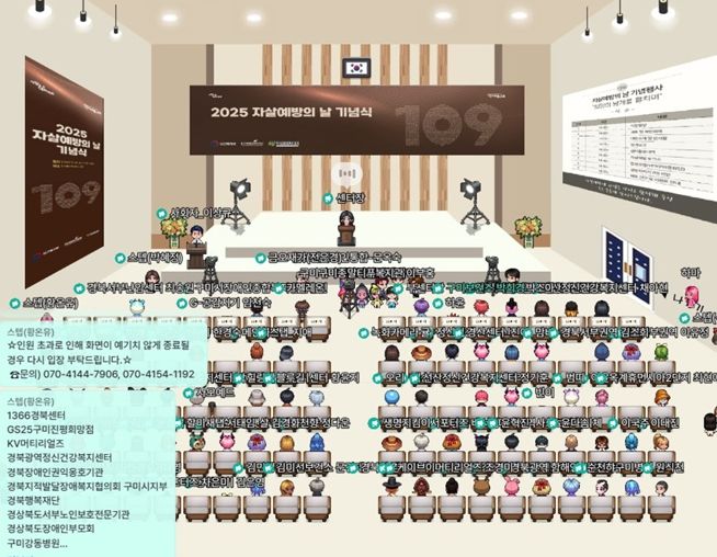뉴한국방송뉴스통신사 신유철기자 기자 | 구미시는 정신건강과 자살예방의 중요성을 알리기 위해 지난 1일 메타버스 플랫폼(ZEP) ‘구미정신건강월드’에서 '제13회 자살예방의 날 기념행사-희망의 날개를 펼치며'를 개최했다.