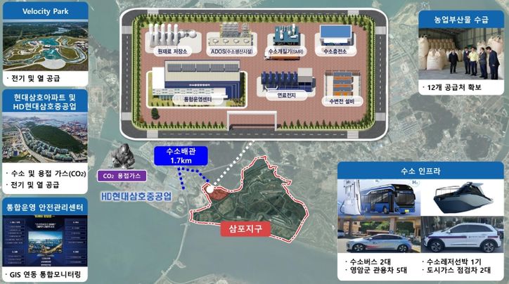 영암군 수소도시의 핵심 내용은 삼호읍 삼포지구에 ▲농업부산물 활용 수소생산시설 1기 설치 ▲수소 배관망 1.7km 구축 및 수소충전소 1개소 설치 ▲수소연료전지 생산 전기·열 기업도시 공급 등이다.