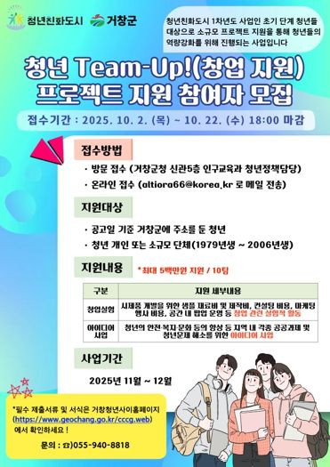 뉴한국방송뉴스통신사 신유철기자 기자 | 거창군은 지역 청년들의 창의적 도전과 자립적 성장을 지원하기 위해 오는 10월 22일까지 청년 Team-up(창업지원) 프로젝트 참여자를 모집한다.
