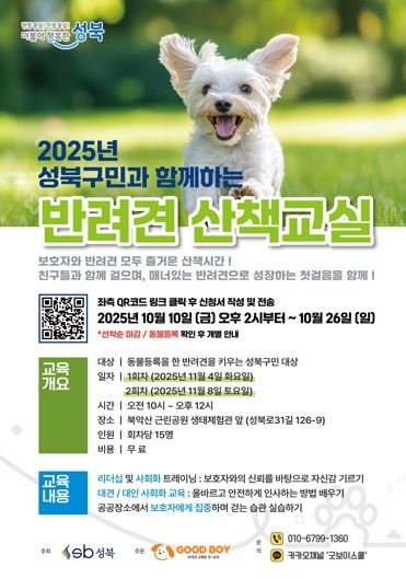 뉴한국방송뉴스통신사 신유철기자 기자 | 서울시 성북구가 11월 4일과 8일 전문가와 함께하는 체험형 반려견 산책교육을 실시한다. 이번 교육은 성북구민과 반려견이 함께 참여해 산책 습관과 사회화 훈련을 배우는 프로그램이다.