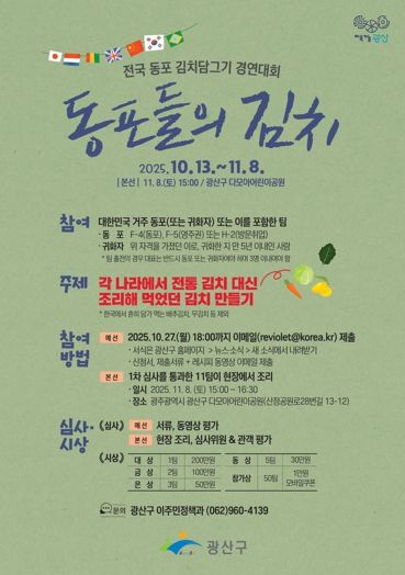 뉴한국방송뉴스통신사 김성의 기자 | 광주 광산구가 13일부터 11월 18일까지 전국 곳곳에 거주하고 있는 동포들을 대상으로 ‘전국 동포 김치담그기 경연대회_동포들의 김치’를 개최한다.