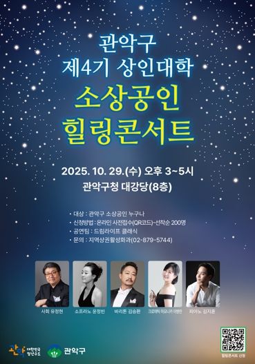 뉴한국방송뉴스통신사 신유철기자 기자 | 관악구는 오는 10월 29일 오후 3시, 구청 8층 대강당에서 관내 소상공인을 위한 힐링콘서트를 개최한다.