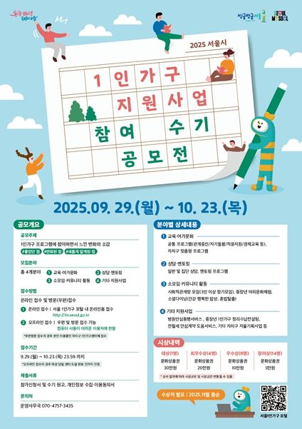 뉴한국방송뉴스통신사 신유철기자 기자 | 서울시가 1인가구 지원사업의 성과를 공유하고 참여자들의 생생한 목소리를 담아내기 위해 '2025년 1인가구 지원사업 참여 수기 공모전'을 개최한다.