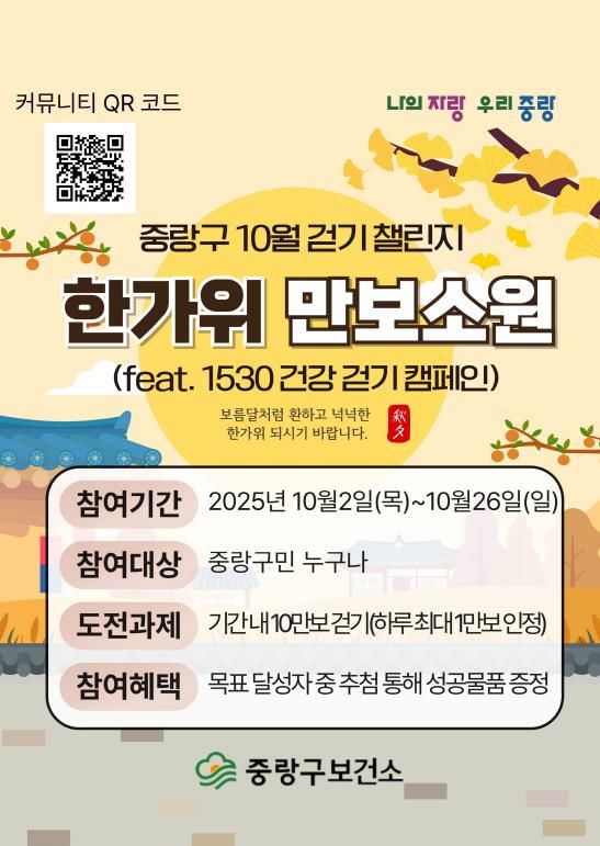 뉴한국방송뉴스통신사 신유철기자 기자 | 중랑구는 모바일 걷기 앱을 활용한 '온라인 걷기 챌린지'를 10월 2일부터 26일까지 25일간 운영한다. 이번 챌린지는 구민들의 일상 속 걷기 실천율을 높이고, 건강한 생활습관을 유도하기 위해 마련됐다.