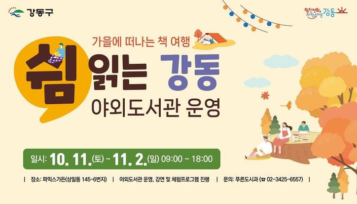 뉴한국방송뉴스통신사 신유철기자 기자 | 강동구는 10월 11일부터 11월 2일까지 한 달간 파믹스가든(상일동 145-6)에서 주말 야외 도서관 '쉼 읽는 강동'을 운영한다고 밝혔다.