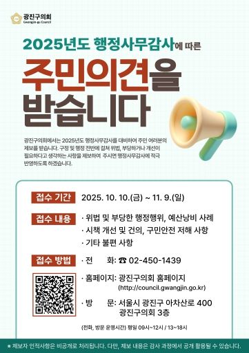 뉴한국방송뉴스통신사 신유철기자 기자 | 광진구의회가 오는 11월 17일부터 진행되는 ‘2025년도 행정사무감사’를 앞두고 주민 의견을 10월 10일부터 11월 9일까지 총 31일간 접수한다.