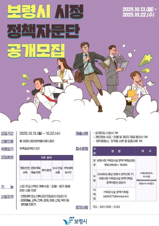 보령시는 이번 자문단 운영을 통해 시정 정책과 사업을 체계적이고 전문적으로 추진하고, 다양한 계층의 현장 목소리와 혁신적 아이디어를 반영한 소통행정을 실현하고자 한다.