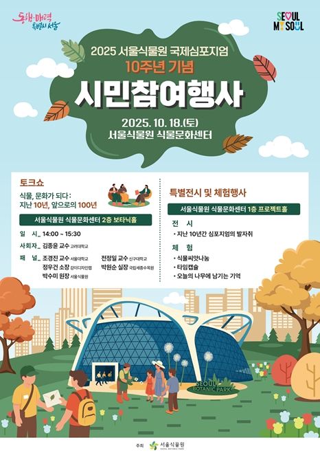 뉴한국방송뉴스통신사 신유철기자 기자 | 서울식물원은 기후변화대응과 생물다양성 보존에 대비하는 식물원의 역할과 미래에 대해 전문가들과 깊이 있는 토론을 나누는 국제심포지엄의 10주년을 맞아 오는 10월 18일, 서울식물원 식물문화센터 일대에서 특별한 참여 행사를 개최한다.