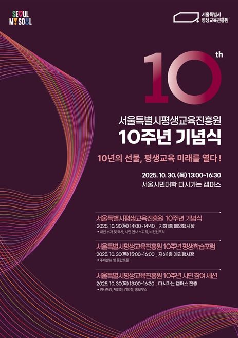 뉴한국방송뉴스통신사 신유철기자 기자 | 서울시평생교육진흥원이 설립 10주년을 맞아 오는 10월 30일 서울시민대학 다시가는 캠퍼스에서 '서울시평생교육진흥원 10주년 기념식'을 개최한다. 이번 행사는 지난 10년의 성과를 되짚고 미래 비전을 제시하는 자리를 넘어, 시민이 직접 참여하고 즐기는 다채로운 축제의 장으로 마련된다.