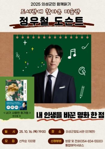 뉴한국방송뉴스통신사 신유철기자 기자 | 의성군은 오는 10월 16일 의성군립도서관에서 정우철 도슨트를 초청해 '내 인생을 바꾼 명화 한 점'을 주제로 저자강연을 개최한다고 밝혔다.