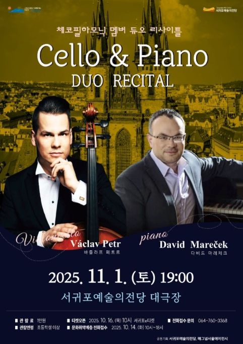 뉴한국방송뉴스통신사 신유철기자 기자 | 서귀포시는 11월 1일 오후 7시, 서귀포예술의전당 대극장에서 체코필하모닉오케스트라 멤버 '첼로 & 피아노 듀오 리사이틀'을 개최한다고 밝혔다.