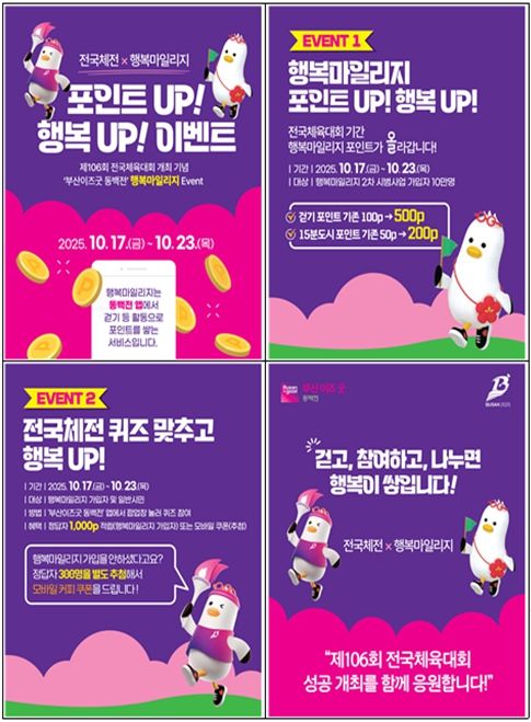 뉴한국방송뉴스통신사 신유철기자 기자 | 부산시는 제106회 전국체육대회 개최를 기념하여 부산이즈굿 동백전 '행복마일리지' 특별 이벤트인 '포인트 업(UP)! 행복 업(UP)!'을 오는 10월 17일부터 23일까지 7일간 추진한다고 밝혔다.