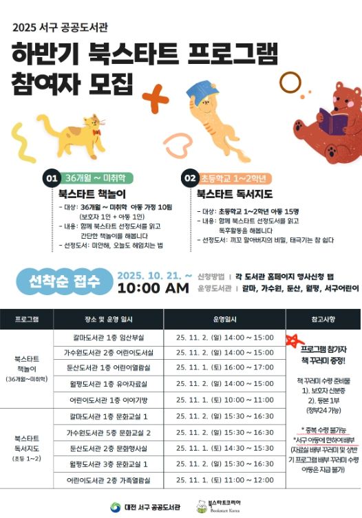 뉴한국방송뉴스통신사 신태공 기자 | 대전 서구 5개 공공도서관은 영유아의 올바른 독서 습관 형성을 위한 하반기‘북스타트 프로그램’을 운영한다고 14일 전했다.