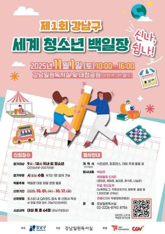 뉴한국방송뉴스통신사 신유철기자 기자 | 꿈이 모이는 도시, 미래를 그리는 강남구가 오는 11월 1일 오전 10시부터 오후 4시까지 강남일원독서실과 대청공원 일대에서 ‘제1회 강남구 세계청소년백일장 신나, 쉼나!’를 개최한다. 이 행사는 국내‧외 국적 청소년이 함께하는 전국 최초의 기초지자체 주관 백일장으로, 다문화 시대와 K-컬처 확산 흐름에 발맞춘 문학축제다.