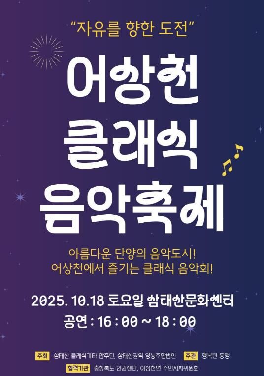 뉴한국방송뉴스통신사 권영분기자 기자 | 충북 단양군은 오는 18일, 어상천 삼태산문화센터에서 ‘제3회 어상천 클래식음악축제’가 열린다고 밝혔다.