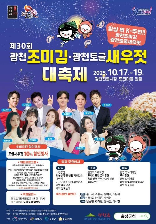 뉴한국방송뉴스통신사 신태공 기자 | 홍성군 광천읍은 오는 17일부터 19일까지 3일간 광천전통시장 및 토굴마을 일원에서 ‘제30회 광천조미김·광천토굴새우젓 대축제’의 성대한 막을 올릴 예정이라고 밝혔다.