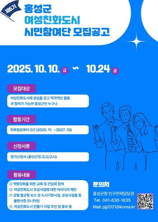 뉴한국방송뉴스통신사 신태공 기자 | 홍성군이 ‘여성친화도시’ 조성을 위한 시민참여단 모집에 나섰다.