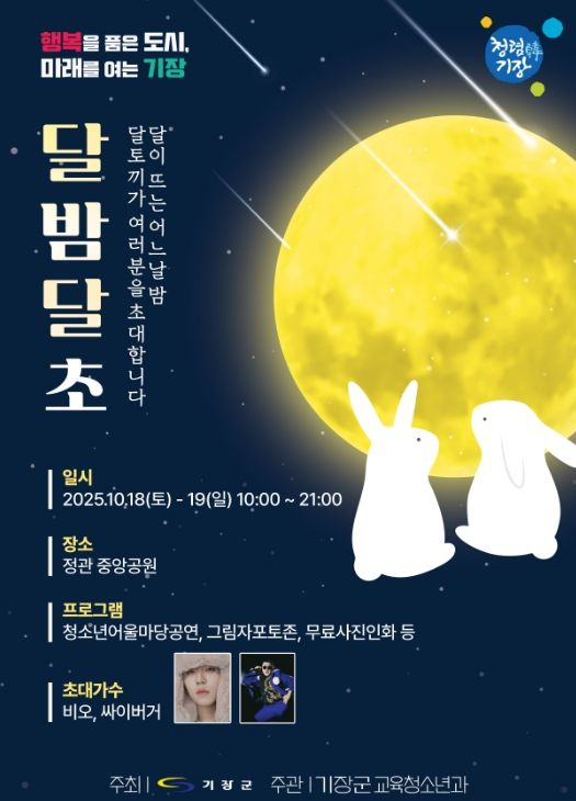 뉴한국방송뉴스통신사 신유철기자 기자 | 기장군은 오는 18일부터 19일까지 정관읍 중앙공원 일원에서 2025 기장군청소년어울마당 ‘달밤달초’를 개최한다고 15일 밝혔다.