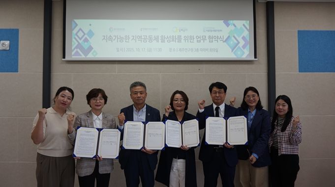 뉴한국방송뉴스통신사 신유철기자 기자 | 제주연구원(원장 유영봉) 제주사회복지연구센터(센터장 오윤정)는 2025년 10월 17일, 지속가능한 지역공동체 활성화를 위해 제주특별자치도 지속가능발전협의회, 일배움터, 제주특별자치도 마을만들기종합지원센터와 업무협약을 체결했다.