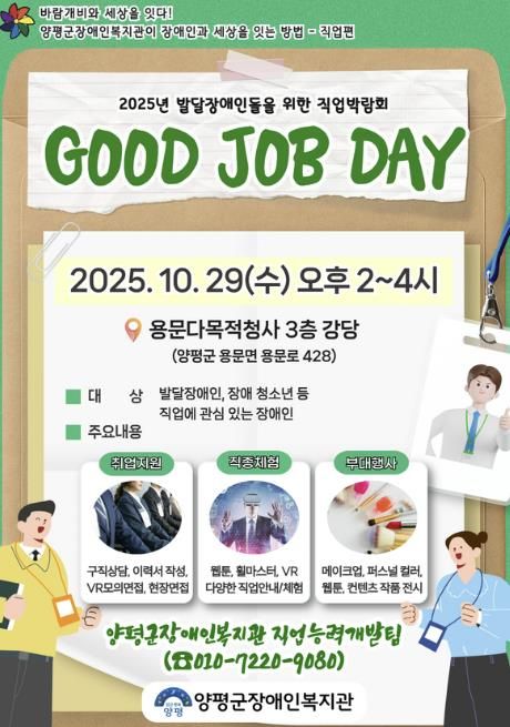뉴한국방송뉴스통신사 신유철기자 기자 | 대한불교조계종사회복지재단이 운영하는 양평군장애인복지관은 오는 29일 오후 2시부터 4시까지 용문다목적청사 3층 강당에서 발달장애인의 직업 탐색 기회를 지원하기 위한 직업박람회 ‘GOOD JOB DAY’를 개최한다.