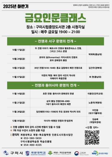 강좌의 대주제는 '전쟁사와 문명의 전개’로 전쟁이 단순한 충돌이 아닌 문명을 재편시키는 동력으로 작용해 온 역사적 의미를 동서양 전쟁사를 통해 탐구한다. 강좌는 10월 17일부터 12월 5일까지 매주 금요일 오후 7시부터 9시까지, 구미시립중앙도서관 시청각실에서 총 8회에 걸쳐 진행된다.