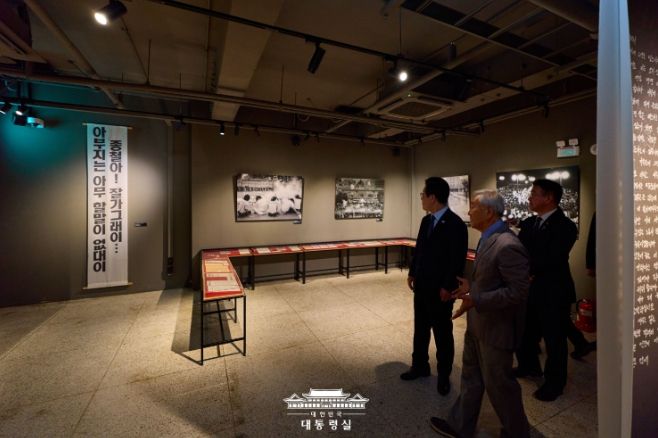 이 대통령은 故 박종철 열사가 고문을 받다 숨진 509호와 민주화운동청년연합 의장으로 활동하다 붙잡혀 고초를 겪었던 故 김근태 전 의원 조사실인 515호 등 전시관을 모두 살펴봤다.