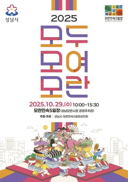 뉴한국방송뉴스통신사 신유철기자 기자 | 성남시는 오는 10월 29일 오전 10시부터 오후 3시 30분까지 모란민속5일장(중원구 둔촌대로 68)에서 ‘2025 모두모여모란’ 축제를 연다.