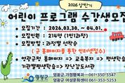 뉴한국방송뉴스통신사 신다은기자 기자 | 영광군은 어린이의 건강한 성장과 다양한 문화·예술 체험 기회를 제공하기 위해 오는 3월 30일부터 4월 1일까지 2026년 상반기 어린이 프로그램 수강생을 모집한다고 밝혔다. 이번 프로그램은 9세 이하 아동을 대상으로 신체활동과 예술, 정서발달을 돕는 다양한 체험형 교육으로 구성되어 ▲베이베붐 ▲트니트니 ▲튼튼쑥쑥 키즈요가 ▲키즈발레 ▲감성동화구연 ▲키즈드럼 ▲사물악기 체험놀이 ▲우리노래 우리놀이 ▲발표력동화구연 등 총 9개 분야 18개 강좌로 운영될 예정이다. 특히 신체활동 중심 프로그램부터 음악·놀이·동화구연 등 감성 발달을 돕는 프로그램을 다양하게 마련해 아이들의 신체 발달과 창의력, 표현력 향상에 도움을 줄 것으로 기대된다. 모집인원은 총214명이며, 강좌별로 소규모 인원을 운영해 보다 집중도 높은 교육 환경을 제공할 계획이다. 수강 신청은 선착순으로 진행되며 1인 1과정 신청이 가능하고 교육장소는 여성문화센터와 홍농읍복지회관 4층에서 제공할 계획이다. 수강신청은 영광군에 주소를 두고 거주하는 아동이면 누구나 가능하고, 영광군 홈페이지를 통