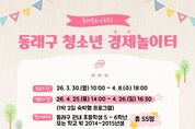 뉴한국방송뉴스통신사 신유철기자 기자 | 부산 동래구는 오는 30일부터 초등학생을 대상으로 경제마켓, 모의투자, 경제 놀이 운동회 등 체험활동과 실습 중심의 다양한 활동을 통해 자기 주도적 글로벌 미래 경제 인재로의 성장을 돕고자 2026년 ‘동래구 청소년 경제 놀이터’ 참가자를 모집한다고 밝혔다. 참가 대상은 초등학교 5~6학년 또는 2014~2015년생 55명으로, 모집 시작일 기준 동래구에 주소를 두어야 한다. 특히 전년도 높은 참가 수요와 만족도를 반영해 올해는 모집 인원을 확대했다. 프로그램은 4월 25일부터 26일까지 1박 2일 숙박형으로 운영된다. 신청 기간은 3월 30일 오전 10시부터 4월 8일 오후 6시까지이며, 참가비는 인당 4만 원이다. 신청은 동래문화교육특구 누리집내 ‘프로그램 신청접수’메뉴에서 ‘동래구 청소년 경제놀이터’를 선택해 가능하며 선착순으로 모집한다. 참가자는 4월 14일 개별 통보할 예정이며, 기타 자세한 사항은 동래구 평생교육과 교육특구계로 문의하면 된다. 동래구 관계자는“매년 큰 관심을 받아온 청소년 경제 놀이터는 올해도 체험 위주의