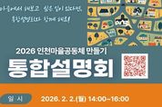 뉴한국방송뉴스통신사 신유철기자 기자 | 인천광역시는 2월 2일 제물포스마트타운 2층 대강의실에서‘2026년 인천광역시 마을공동체 만들기 통합설명회’를 개최한다고 밝혔다. 이번 설명회는 마을공동체 관계자와 활동가, 일반 시민 등 약 150명이 참석할 예정으로, 인천시와 군·구가 추진하는 마을공동체 공모사업과 주요 지원 정책을 한자리에서 소개해 시민들의 사업 참여를 확대하기 위해 마련됐다. 인천시는 올해 제3기 마을공동체 만들기 기본계획(2026~2030)을 수립하고, ‘시민과 함께, 자치와 연대로 성장하는 인천 마을공동체’를 비전으로 설정했다. 이는 주민이 스스로 의제를 발굴하고 실행하는 자치와 공동체 간 상생과 연대를 통해 마을공동체가 단발성 사업을 넘어 시민의 삶과 도시문화 속에 지속적으로 자리 잡도록 하겠다는 취지를 담고 있다. 설명회 1부에서는 인천시가 직접 기획해 추진하는 ▲네트워크 활성화 ▲마을 홍보 ▲세대 공감 ▲마을길 잇기 ▲기타 주민제안 등 5개 유형의 기획 공모사업을 소개한다. 이와 함께 마을지원활동가 운영, 교육, 공론장, 성과공유회 등 마을공동체의 성장을 지원하는 주