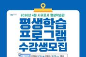뉴한국방송뉴스통신사 신유철기자 기자 | 서귀포시는 시민의 다양한 배움의 기회를 제공하기 위해 2026년 4월 개강 서귀포시 평생학습관 프로그램 수강생을 모집한다고 밝혔다. 이번 교육과정은 직업능력, 인문교양, 문화예술 등 3개 분야, 15개 강좌, 총 235명의 수강생을 모집하여 운영할 예정이다. 수강신청은 16일 오전 9시부터 25일 오후 6시까지 서귀포시 평생학습관 홈페이지에서 온라인을 통한 선착순 접수로 진행되며, 정원 미달 강좌는 26일부터 27일까지 이틀간 추가접수를 받는다. 모집 대상은 만 19세 이상 서귀포시민이며, 서귀포시민을 우선으로 선발하고 타지역 거주자는 후순위로 선정된다. 특히, 지역청년의 성장을 지원하기 위해 직업능력 분야 2개 과정은 청년층(만19세~39세)를 우선 선발(정원의 30%)하여 운영한다. 서귀포시 관계자는 “평생학습관에서는 자격증 취득과정 운영뿐만 아니라, 직장인과 시민들의 학습 접근성을 높이기 위해 주말 및 야간 프로그램을 확대하여 시민들의 평생학습 참여 기회를 넓히고자 노력하고 있다”라고 말했다. [뉴스출처 : 제주도 서귀포시]