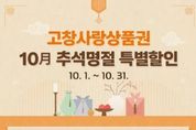 뉴한국방송뉴스통신사 김성의 기자 | 고창군이 추석을 맞아 군민 생활안정과 지역경제 활성화를 위해 ‘고창사랑상품권 특별할인 행사’를 진행한다. 이번 행사는 10월 한 달간 진행된다. 이번 특별할인은 △상품권 구매시 10% 선할인 △고창사랑카드 결제시 10% 캐시백 적립을 통해 최대 20% 혜택을 받을 수 있도록 구성됐다. 특히, 월 구매한도를 100만 원까지 확대해 군민들의 혜택을 더욱 강화했다. 예를 들어, 10만원 상품권 구매 시 10%(1만 원) 선할인을 적용받아 9만원에 구매하고, 이후 고창사랑카드로 결제하면 결제금액의 10%가 캐시백으로 적립돼 실질적으로 최대 20% 혜택을 누릴 수 있다. 다만, 선할인(10%)이 적용된 금액은 캐시백 적립 대상에서 제외된다. 심덕섭 고창군수는 “이번 추석 명절 특별 할인을 통해 군민들께는 생활비 부담을 덜어드리고, 지역 소상공인들에게는 매출 증대 효과가 기대된다”며 “특히, 군에서 지급하는 군민활력지원금과 정부의 민생소비쿠폰이 더해져 군민 모두가 더욱 넉넉한 추석 명절을 보내시길 바란다”고 밝혔다. 한편, 고창사랑상품권은 전통시장과
