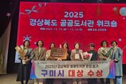뉴한국방송뉴스통신사 신유철기자 기자 | 구미시는 지난 15일 열린 ‘2025 경상북도 공공도서관 워크숍’ 내 ‘공공도서관 운영평가 시상식’에서 도내 43개 공공도서관 중 전체 1위를 차지했다. 그룹별 평가에서도 구미시립중앙도서관이 A그룹 대상을, 구미도시공사 소속 봉곡도서관이 B그룹 우수상을 받으며 2년 연속 두 개관이 동시에 수상하는 성과를 거두었다. 이번 평가는 △예산 △장서 △사서 △공간 △서비스 △협력 △경영계획 △우수사례 등 8개 항목, 13개 지표를 기준으로 전년도(2024년) 실적을 종합적으로 검토해 이뤄졌다. 구미시립중앙도서관은 예산과 장서 확충, 전문사서 배치, 대출·프로그램 운영 증가, 우수사례 선정 등 전 부문에서 고르게 높은 점수를 받으며 A그룹 최고 점수를 기록했다. 봉곡도서관 역시 서비스 프로그램 운영 강화와 지역 협력 기반 확대로 긍정적인 평가를 받았다. 구미시의 연이은 수상은 체계적인 도서관 운영과 꾸준한 인프라 투자, 시민 이용 활성화 노력이 반영된 결과다. 구미시는 도서관을 문화·학습·소통이 결합된 지역 플랫폼으로 키우기 위해 공간 개선, 자료 확충, 디지털 기반 서비스 확대 등을 지속적으로