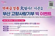 뉴한국방송뉴스통신사 신유철기자 기자 | 부산시는 오늘(16일)부터 12월 31일까지 77일간, 고향사랑기부제 참여 확산을 위해 '역대급 경품 대발사 시즌2! 부산 고향사랑기부제 연말 빅 이벤트'를 개최한다고 밝혔다. 지난 5월 진행된 ‘역대급 경품 대발사’ 이벤트는 해운대 5성급 호텔 숙박권을 포함한 푸짐한 경품으로 많은 시민들의 뜨거운 관심과 참여 속에 성황리에 마무리됐다. 이번 시즌2 이벤트는 그 성원에 힘입어 더욱 풍성한 혜택과 경품으로 시민들을 다시 한번 찾아온다. 특히, 올해 10월 17일부터 부산에서 개최되는 제106회 전국체육대회와 연계해 이번 이벤트를 가을부터 연말까지 이어가며, 시민들에게 다채로운 혜택과 즐거움을 제공할 계획이다. 이와 함께 시는 전국체전 기간(10.17.~10.23.)과 전국장애인체전 기간(10.31.~11.5.)에 ‘고향사랑기부제 홍보 공간(부스)’을 운영해 현장 방문객들에게 기부제 취지와 참여 방법을 적극 알릴 예정이다. 또한 이벤트 기간 중 시청에 1회 10만 원 이상 기부한 기부자에게 기본혜택 2가지와 함께 특별한 추가 경품 4가지를 증정한다.