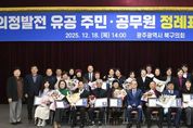 뉴한국방송뉴스통신사 김성의 기자 | 광주 북구의회는 지난 18일, 지역사회 발전에 헌신한 유공자들의 노고를 기리기 위해 ‘2025년도 4분기 정례표창 수여식’을 개최했다. 이번 수여식은 투철한 봉사 정신으로 지역 발전과 주민 화합에 앞장선 구민 27명과 공무원 11명을 선정해 노고를 격려하고 감사의 마음을 전하고자 마련됐다. 행사는 색소포니스트의 식전 공연을 시작으로 국민의례, 표창패 수여, 축하 인사 및 기념촬영 순으로 진행됐다. 특히 이날 행사에서는 ‘어린이·청소년 모의의회 체험 수기 공모전’ 시상식도 함께 열려 의미를 더했다. 공모전에서 우수한 성적을 거둔 곡성중앙초등학교와 지산중학교 학생 7명에게 최우수상(3명), 우수상(2명), 장려상(2명) 상장이 수여됐다. 최무송 의장은 “항상 지역 곳곳에서 묵묵히 봉사하며 살기 좋은 북구를 만들기 위해 애써주신 수상자분들께 깊이 감사드린다”며 “북구의회도 수상자 여러분들의 땀과 헌신에 보답할 수 있도록 구민을 위한 의정활동에 최선을 다하겠다“고 전했다. [뉴스출처 : 광주광역시북구의회]
