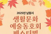 뉴한국방송뉴스통신사 김성의 기자 | 남원시가 후원하는 2025 남원시 생활문화예술동호회 페스티벌이 9월 28일에 남원 사랑의 광장에서 개최한다. 이 행사는 (사)남원시 생활문화예술동호회 네트워크에서 주관하는 축제로, 지역 예술인 및 생활 문화예술 동호인 500여 명과 남원 시민이 함께하는 남원의 생활 문화예술 축제이다. 오후 1시부터 오후 6시까지 남원 사랑의 광장 일원에서 진행되는 이번 축제는 18개 동호회의 음악·무용·농악 등 다양한 무대 공연이 펼쳐지고, 나만의 예술적 감각을 담은 생활용품을 제작해 볼 수 있는 전시 및 체험 부스가 마련됐다. 이기영 생활문화예술동호회 네트워크 이사장은 “이번 축제를 통해 남원 시민들이 함께 즐길 수 있는 다양한 프로그램이 마련됐다.”라며, “앞으로의 활동으로 시민 여러분이 즐거운 문화예술 활동에 참여할 수 있도록 노력하겠다.”라고 밝혔다. 최경식 남원시장은 “이번 행사를 통해 생활 문화예술인의 자긍심을 높이고, 시민 여러분이 생활 문화예술을 접할 수 있는 장이 될 것이다.”라며, “시민의 화합과 생활 문화예술 발전의 계기가 될 것이다.”라고 말했다. [뉴스
