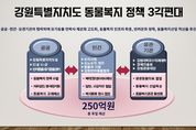 뉴한국방송뉴스통신사 신유철기자 기자 | 강원특별자치도는 2월 20일 오후 2시 강릉에 위치한 도 반려동물지원센터에서 ‘강원형 동물복지 정책’을 발표하고, 복지‧의료‧산업‧관광을 아우르는 4대 전략을 본격 추진한다고 밝혔다. - 이번 정책은 반려동물 양육이 일상화된 사회 변화에 대응해 공공의 역할을 강화하기 위해 마련됐다. 현재 전국 반려 가구는 591만 가구로 전체 가구의 25% 이상을 차지하고 있으며, 반려동물(개‧고양이)은 약 800만 마리 수준으로 추산된다. - 이 자리에는 김진태 도지사를 비롯해 강원경제진흥원, 강원관광재단, 도수의사회장, 강원대 수의과대학장, 군견훈련소 교관, 강릉 주민, 강릉동물보호센터장 등 각계 전문가와 현장 관계자들이 참석했다. 참석자들은 정책 방향을 공유하고 반려동물지원센터 공간 확대 필요성, 입양 이후 보호자와 유기견을 위한 교육‧관리 지원 강화 방안 등 다양한 의견이 논의됐다. 김진태 지사는 “동물복지를 하나의 정책 아젠다로 삼아 보다 체계적으로 추진하려고 한다”며, “이를 위해 각 기관과 전문가들의 협력이 반드시 필요하다”고 밝혔다. 이