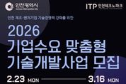 뉴한국방송뉴스통신사 신유철기자 기자 | 인천테크노파크(인천TP)는 지역 제조벤처기업의 기술경쟁력 강화를 위해 ‘2026년 기업수요 맞춤형 기술개발사업’의 참여기업을 오는 3월 16일까지 모집한다고 밝혔다. 이번 사업은 인천 소재 제조벤처기업 중, 최근 5년 이내에 민간 액셀러레이터(AC)나 벤처캐피탈(VC) 등 적격 투자기관으로부터 투자를 유치한 기업을 대상으로 한다. 총 6개 내외의 과제를 선정해 기업당 최대 7,500만 원의 기술개발비를 지원할 계획이다. 지원금은 신규 채용 인건비, 전문가 활용비, 시제품 제작 및 성능 시험·평가 등 사업화와 상용화에 필요한 제반 비용으로 활용할 수 있다. 특히 선정 기업은 스케일업TIPS 운영사를 통해 지식재산권(IP) 경영진단 등의 컨설팅을 받게 된다. 이 중 성과가 우수한 기업은 스케일업TIPS 운영사로부터 10억 원 규모의 직접 투자와 함께 스케일업TIPS 프로그램 추천 기회를 얻을 수 있다. 최종적으로 스케일업TIPS에 선정되면 향후 3년간 총 20~30억 원의 R·D 자금을 후속 지원을 받을 수 있다. 사업 신청은